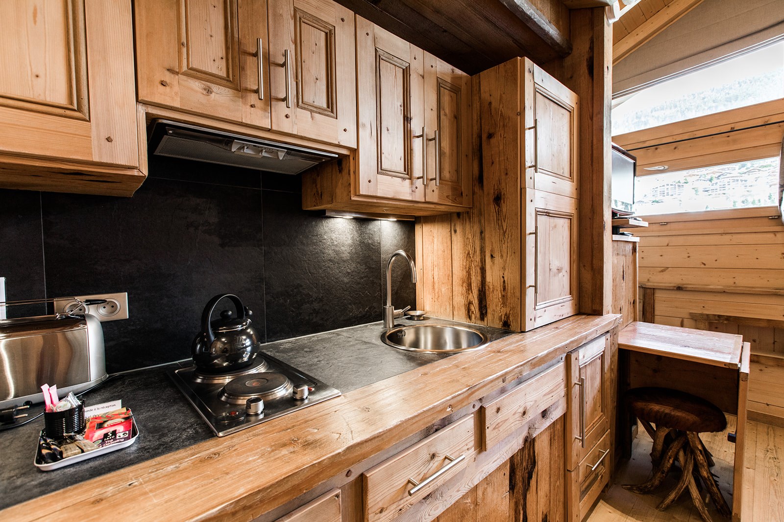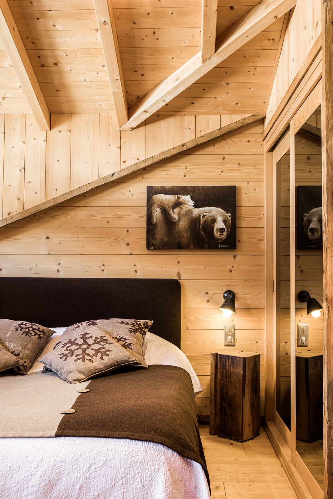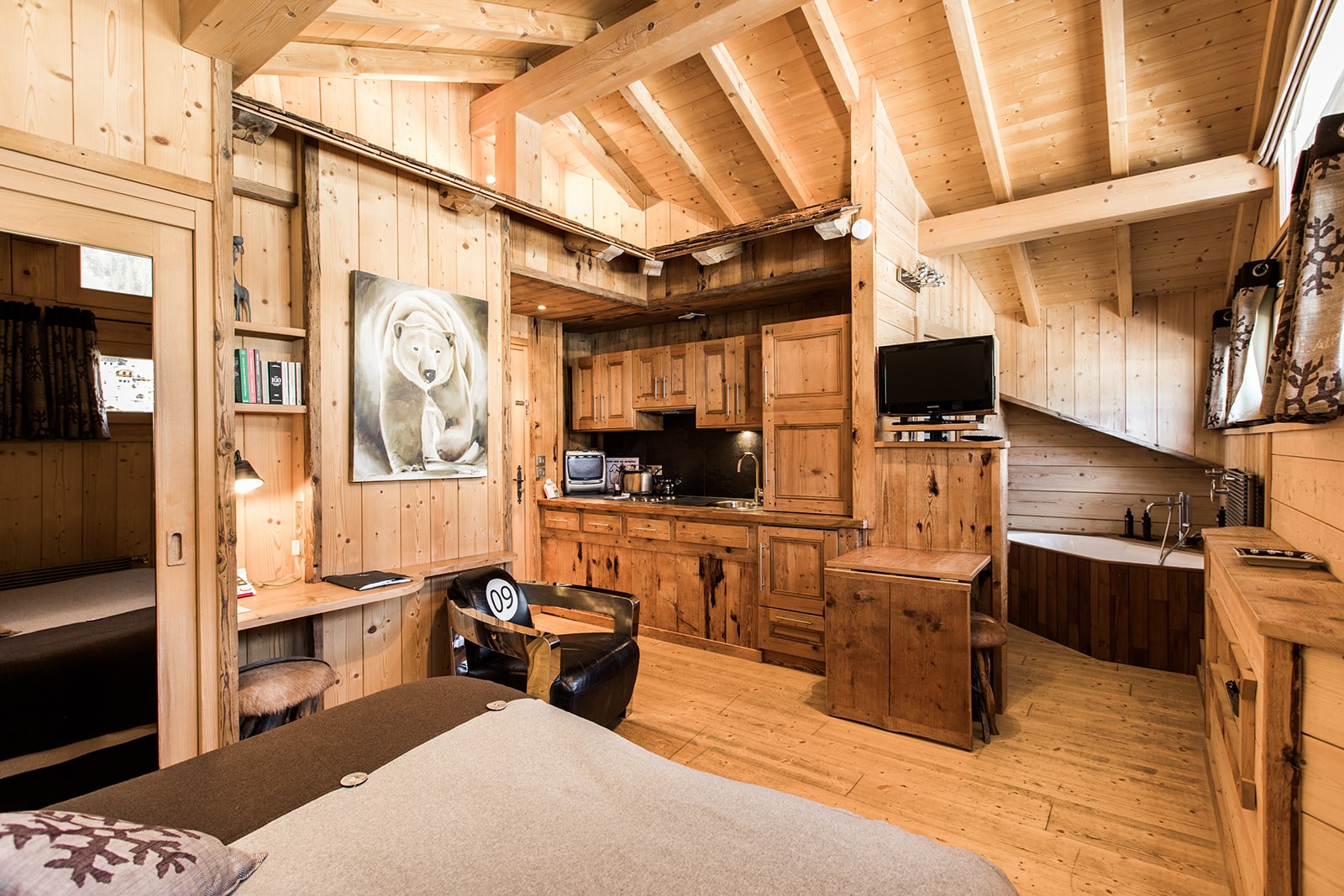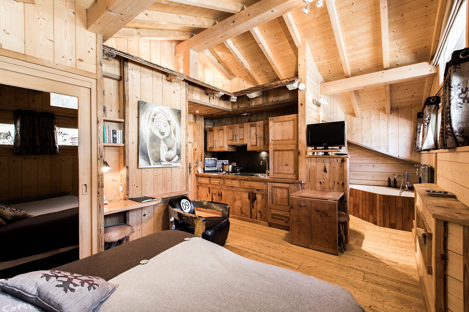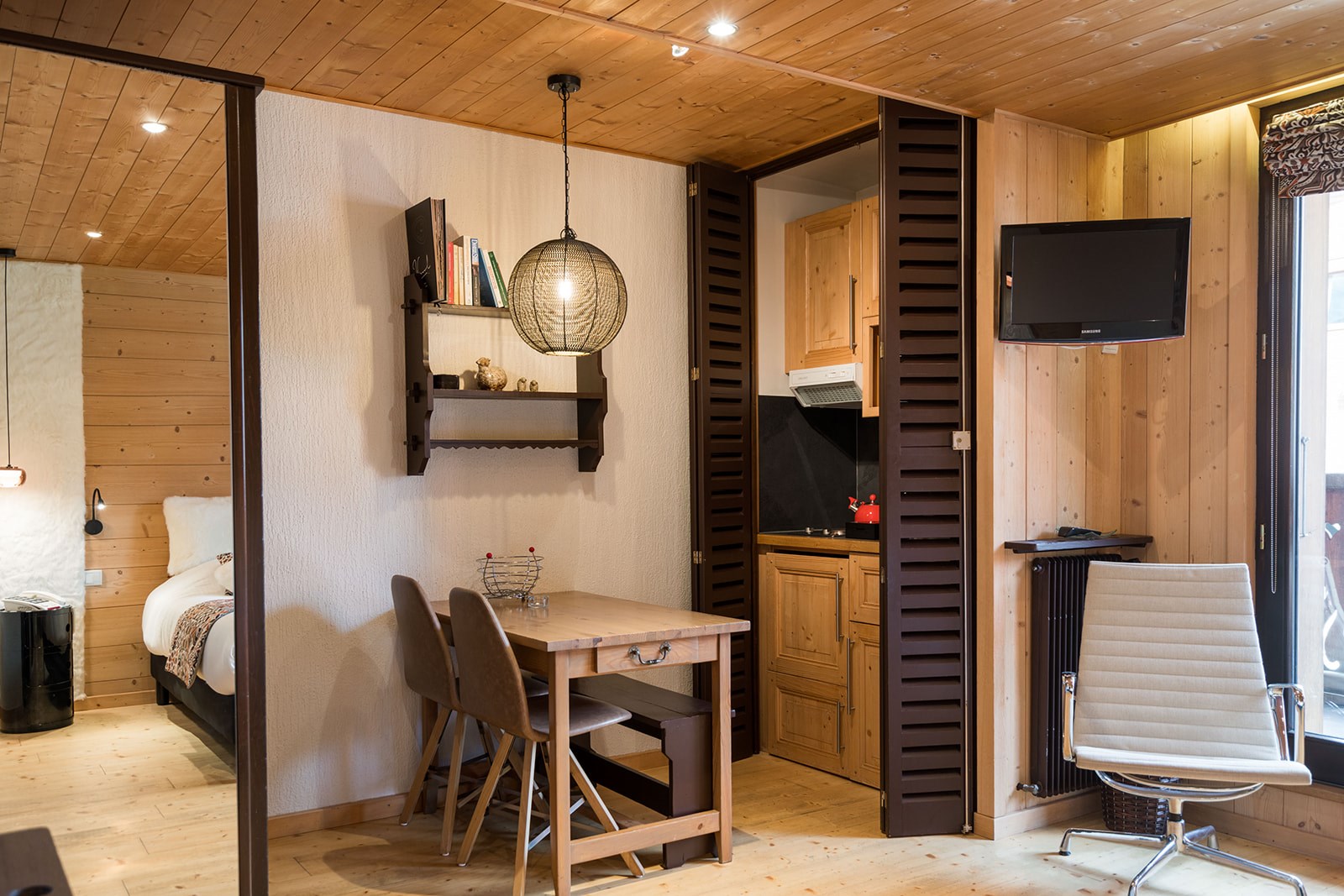 Ambiance toute particulière aux couleurs montagne pour ces jolies chambres Doubles M et S avec kitchenette et vue sur le village pour les S ; sur les montagnes et le jardin pour les M.