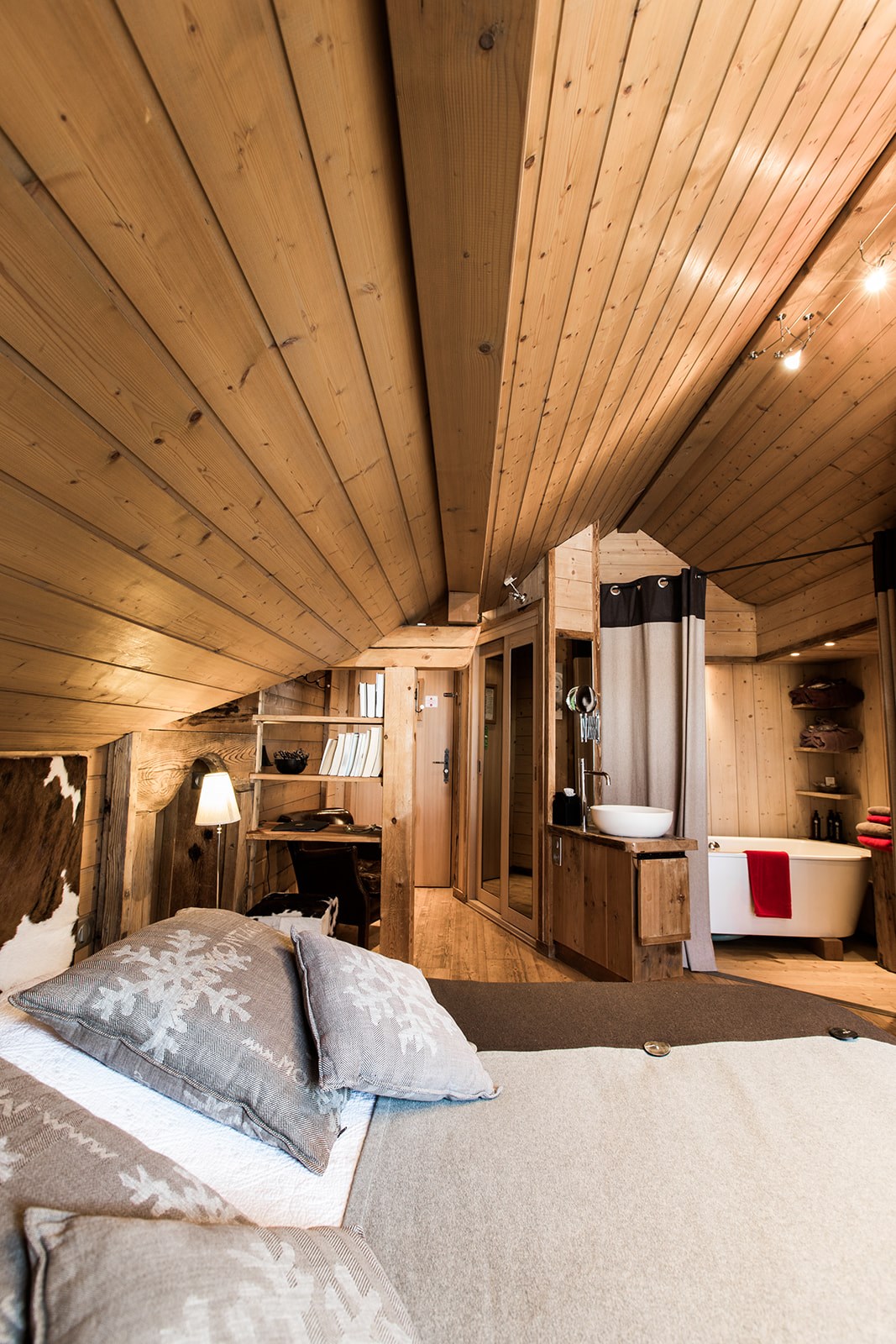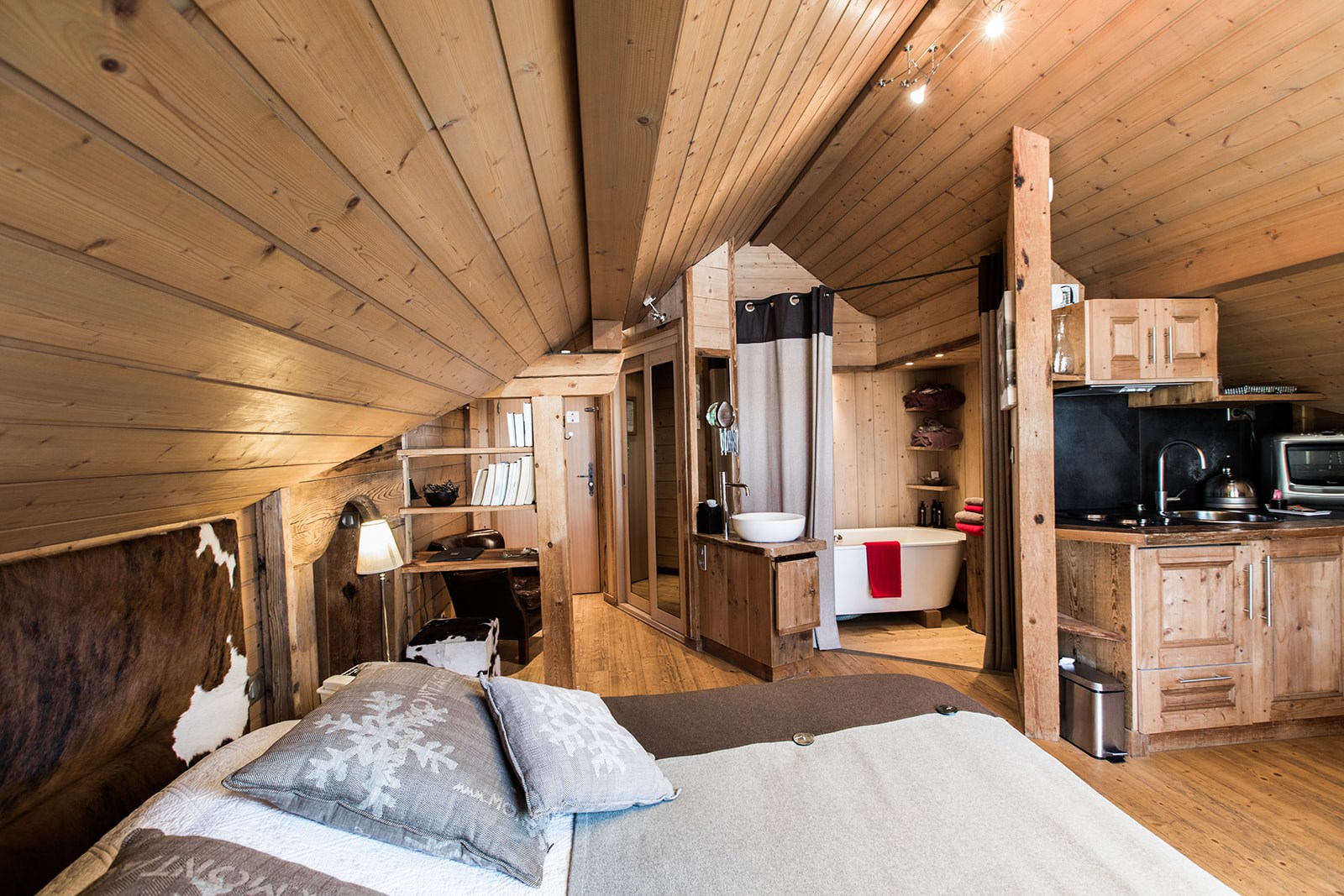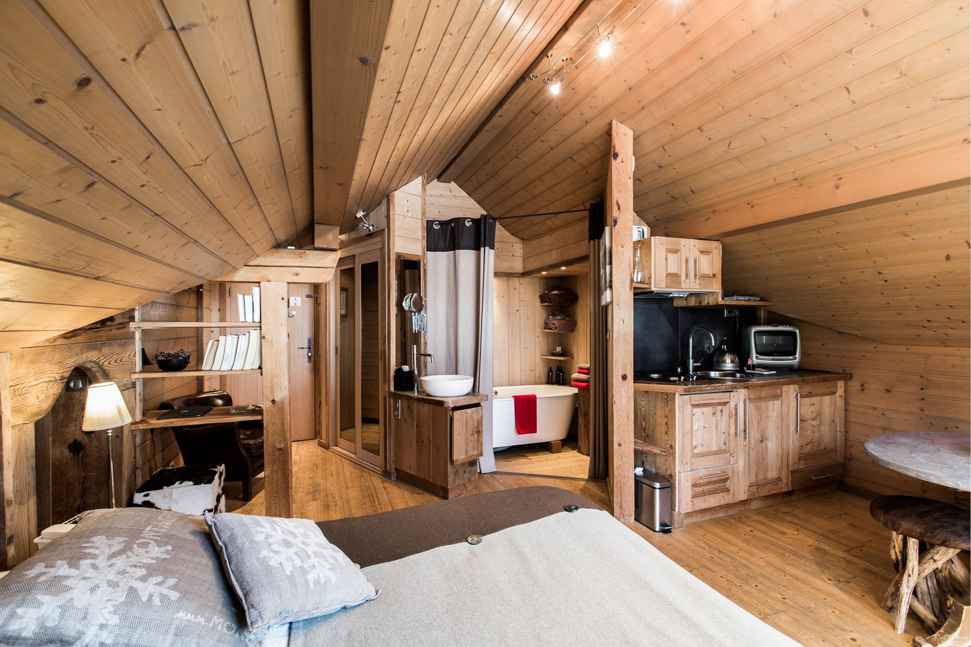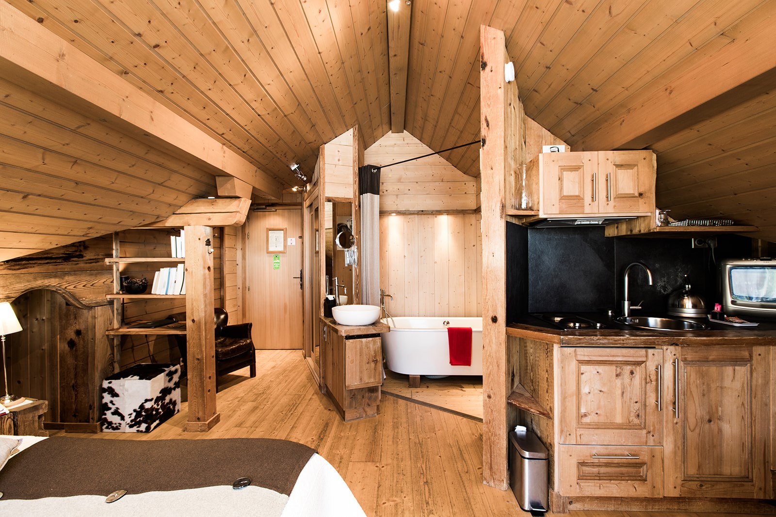 Conçue pour deux adultes et un enfant, elle regorge de détails : salle de bains ouverte avec baignoire Starck® ; petite alcôve pour un enfant, (comme une petite chambre secrète), une kitchenette et une ambiance chalet.