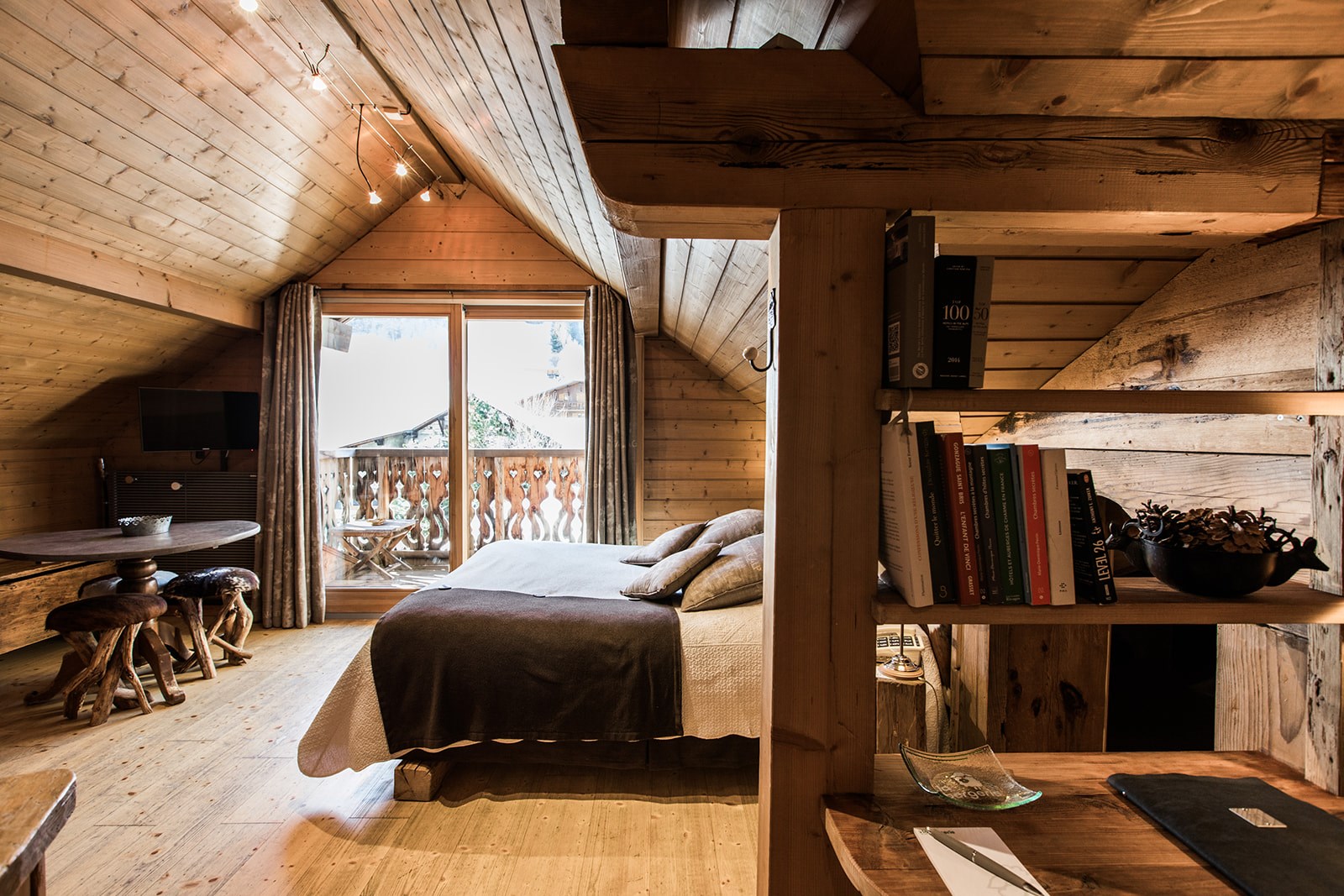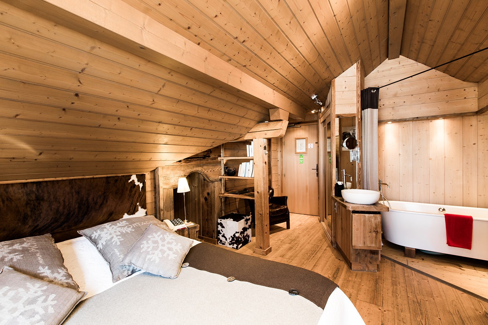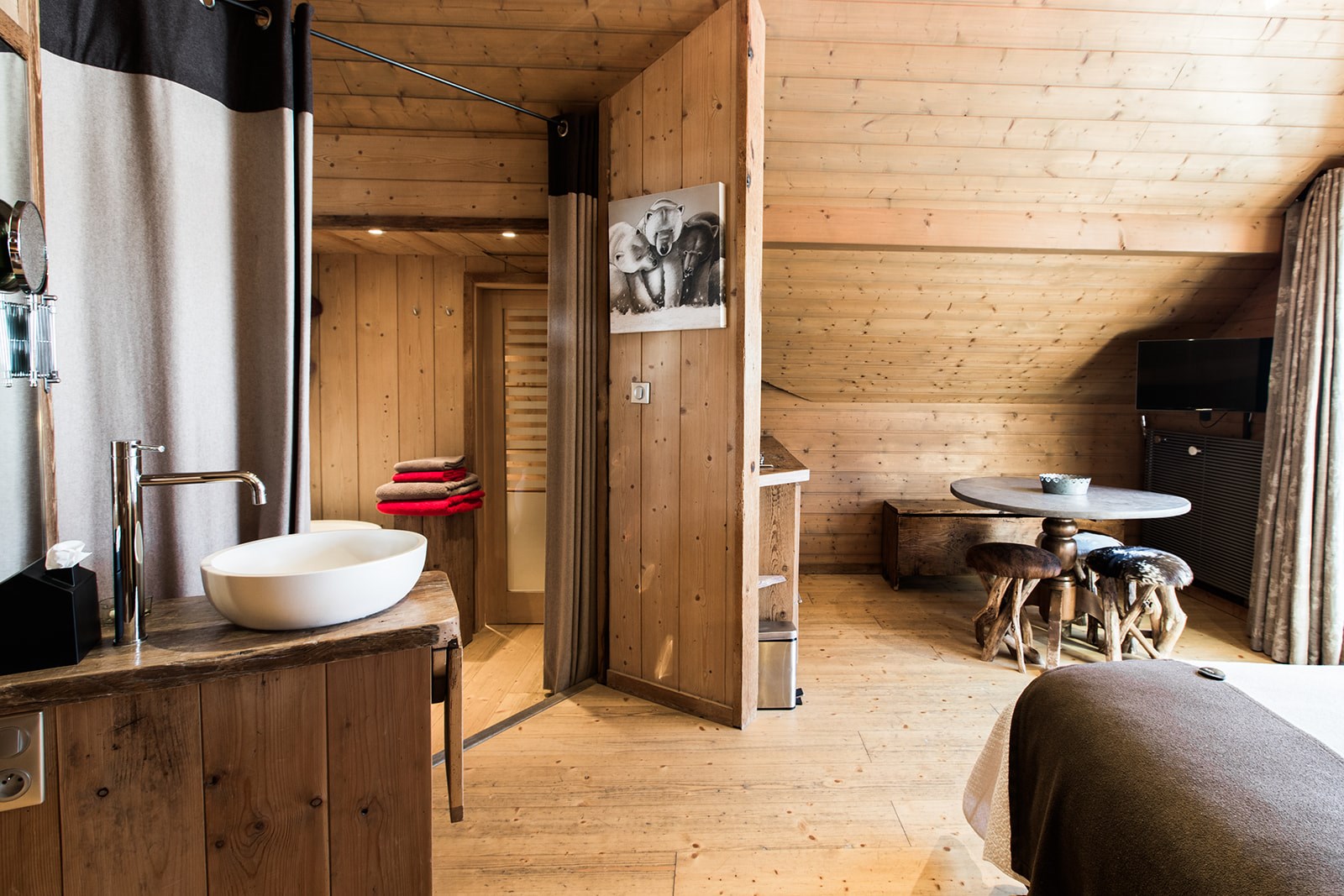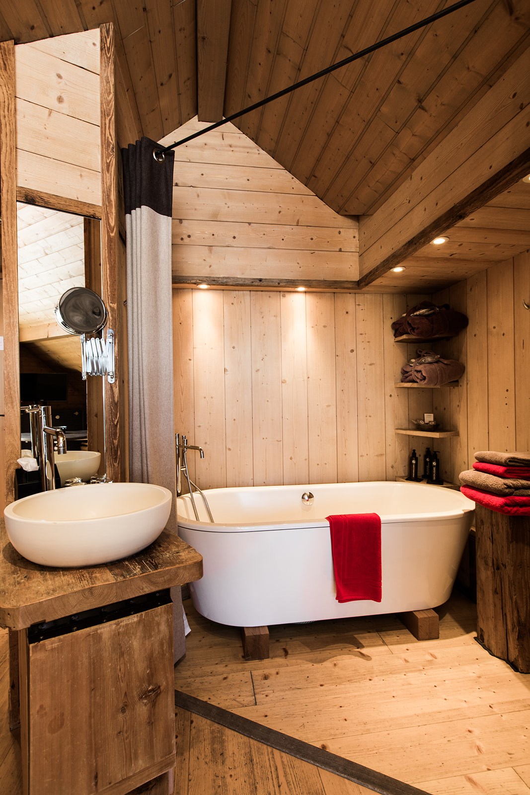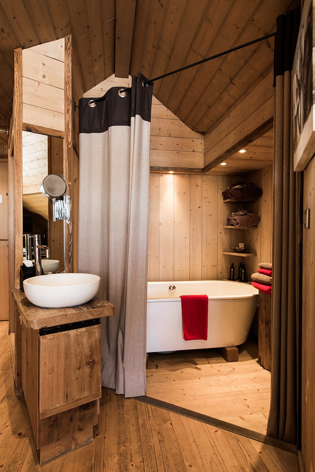 Conçue pour deux adultes et un enfant, elle regorge de détails : salle de bains ouverte avec baignoire Starck® ; petite alcôve pour un enfant, (comme une petite chambre secrète), une kitchenette et une ambiance chalet.